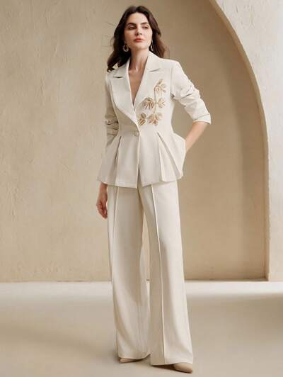 女性用エレガントな高級フォーマル ビーズ刺繍ウエストシェイピング 長袖ブレザージャケットとフレアパンツ 2ピーススーツセット、通勤に最適なファッション-61%