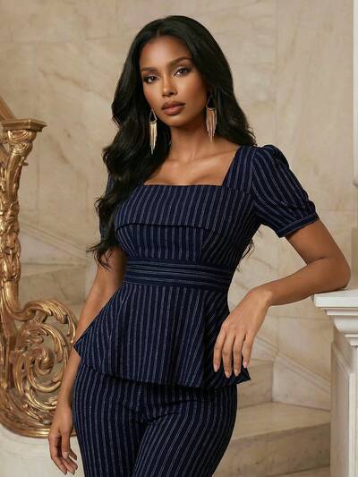 女性用 モダンエレガントネイビーブルーストライプ スクエアネック パフスリーブ ウエストマーク 非対称裾ブラウス-66%