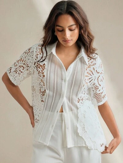 Anewsta レース 透かし彫り衿 半袖ブラウス レディース-25%
