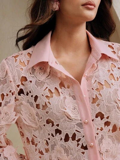 女性の優雅な花柄レースホロースタンドカラー長袖ブラウス-33%
