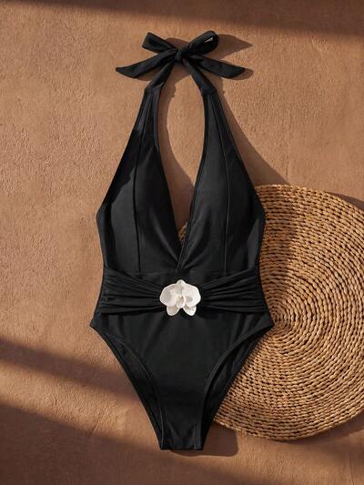 バケーション ビーチ 3Dフラワーデコレーション バックレス ホルターワンピース水着-32%