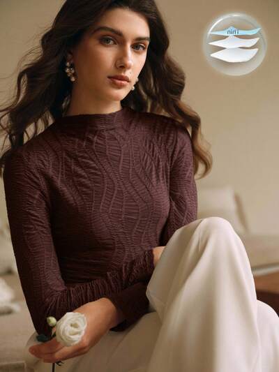 Anewsta Essential Anewsta レディース エレガントなフィッティングテクスチャークリンクルカジュアルバケーション長袖通勤スリムフィットブラウンラウンドネック長袖Tシャツ、春-33%