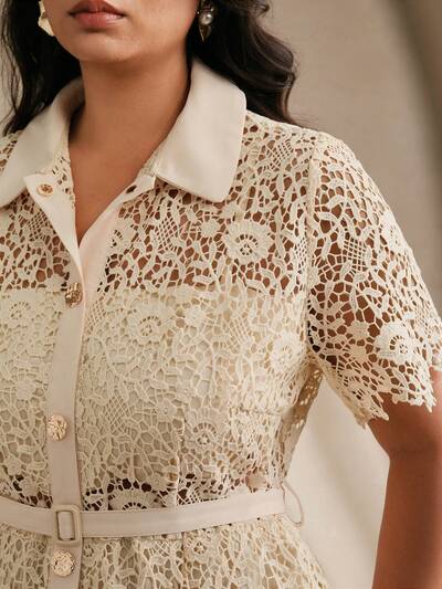 Vestido de Manga Curta Médio Elegante em Renda Solúvel em Água, Elegante para Primavera/Verão, Conjuntos para Festivais, Férias, Tamanhos Grandes para Mulheres