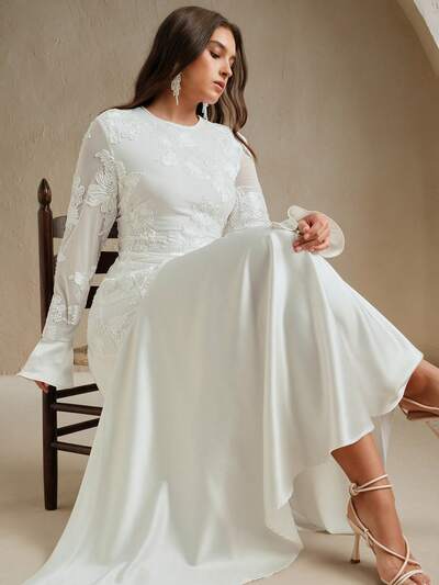 Vestido Elegante de Manga Longa com Bordado Floral e Retalhos, Tamanhos Plus Size para Mulheres